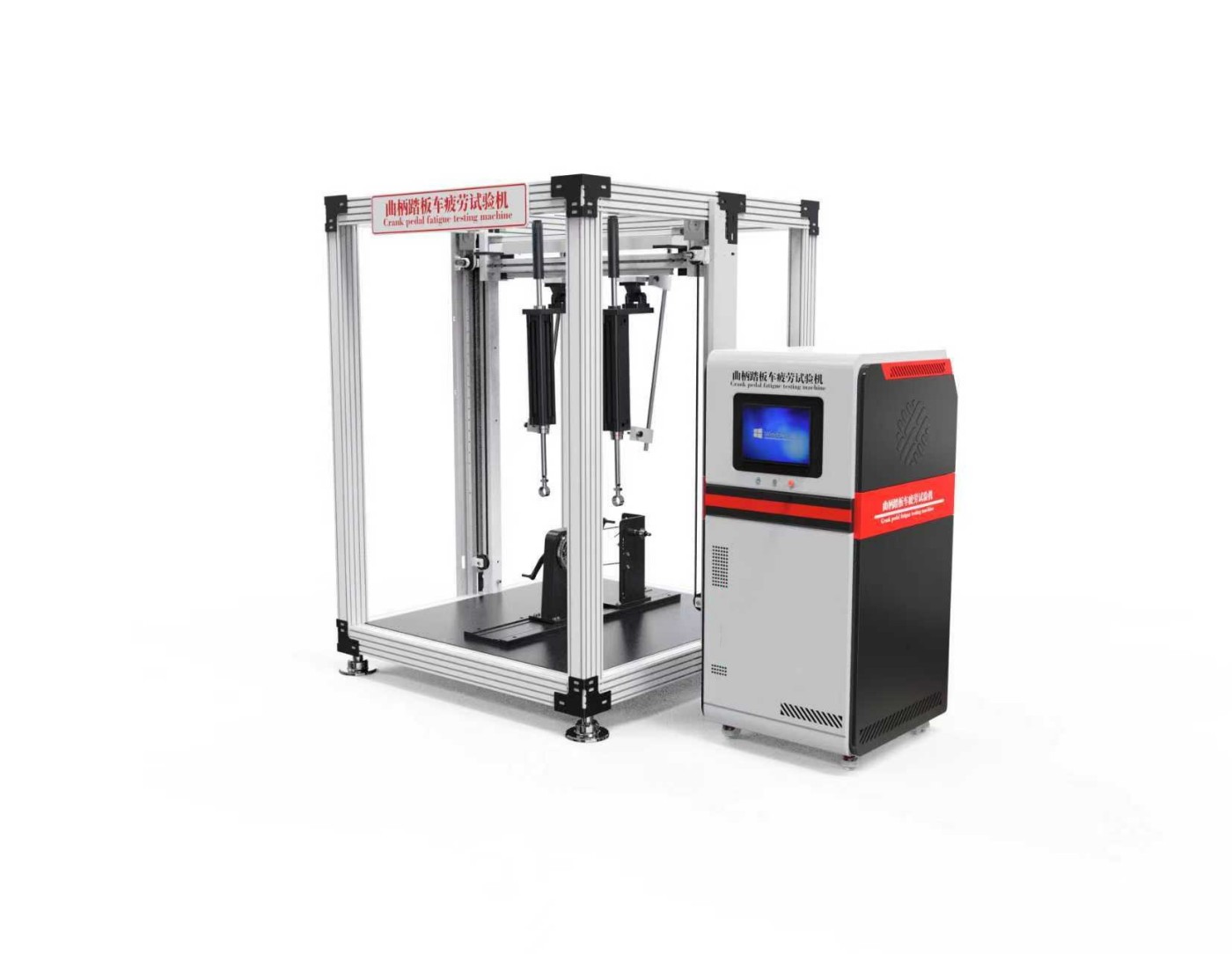 曲柄踏板车疲劳试验机是一种专门用于模拟骑行过程中车架、曲柄、踏板等关键部件承受周期性载荷的试验设备。其核心功能是通过高频、重复的力作用,加速材料疲劳过程,评估部件在长期使用中的结构稳定性、抗裂纹扩展能力及疲劳寿命,确保产品符合安全标准。